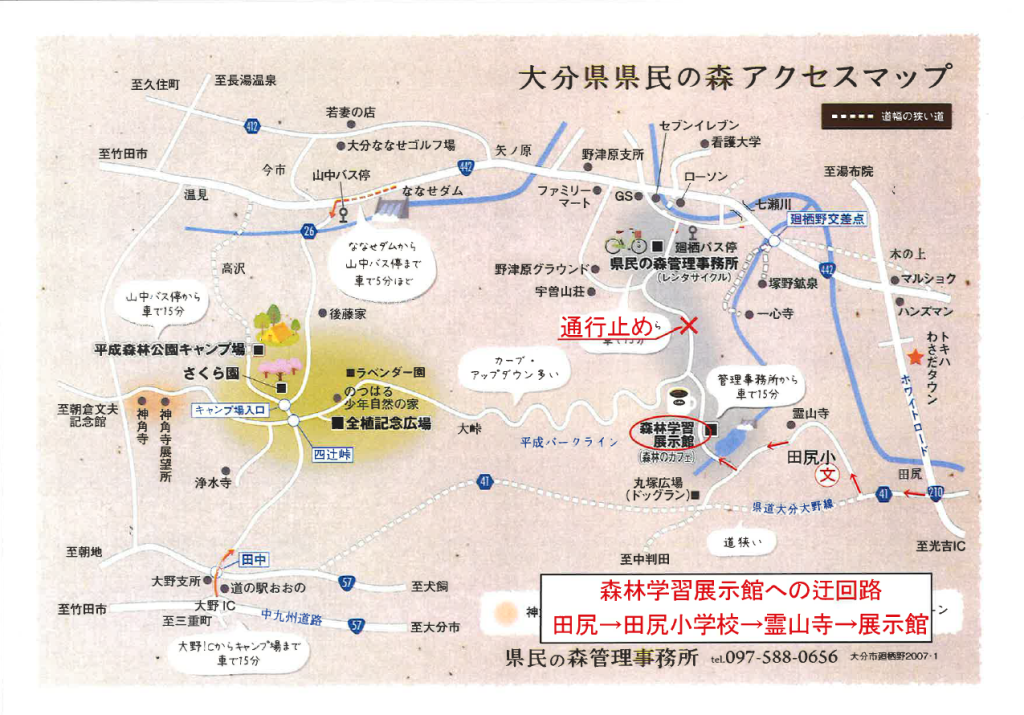 大分市内から森林学習展示館へは、田尻から田尻小学校・霊山寺前を通過してお越しください。